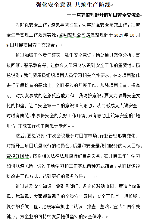 強(qiáng)化安全意識(shí) 共筑生產(chǎn)防線 ——房建監(jiān)理部開展項(xiàng)目安全交流會(huì)