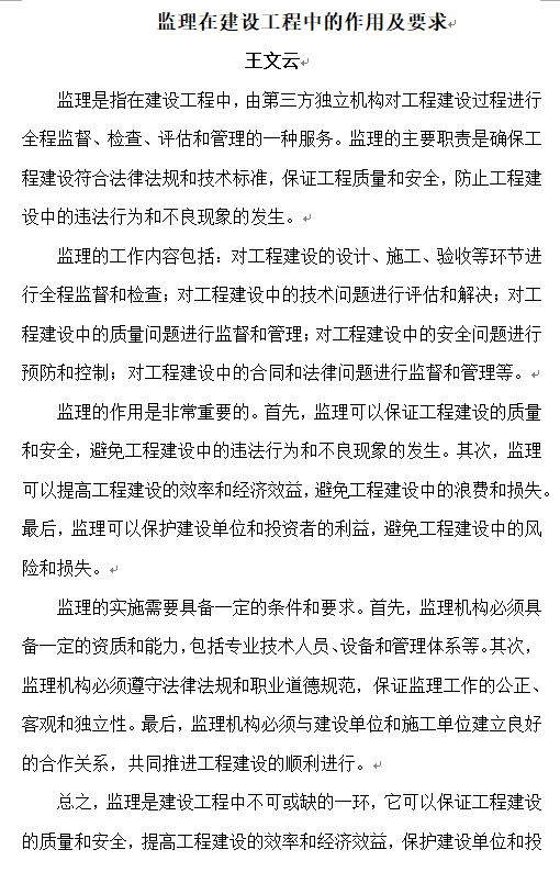 監(jiān)理在建設工程中的作用及要求——王文云