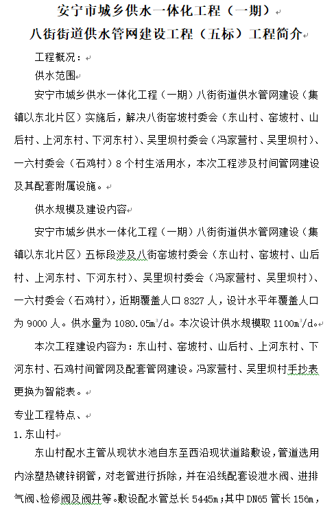 安寧市城鄉(xiāng)供水一體化工程(一期) 八街街道供水管網(wǎng)建設(shè)工程(五標(biāo))工程簡介