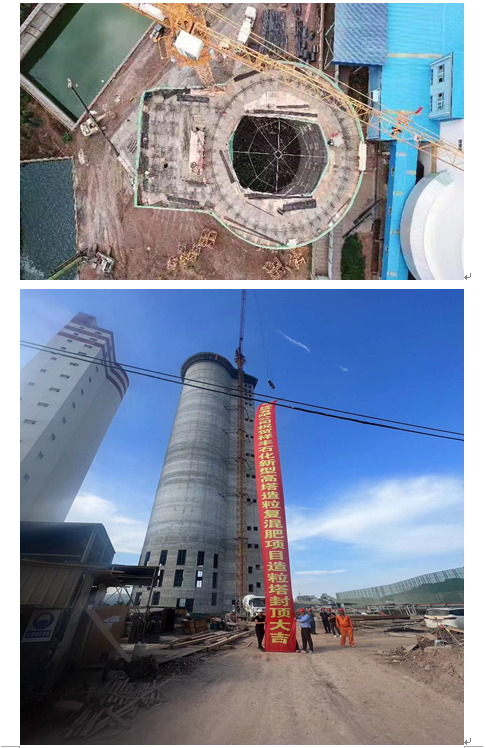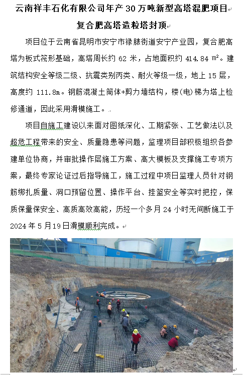 云南祥豐石化有限公司年產(chǎn)30萬噸新型高塔混肥項(xiàng)目復(fù)合肥高塔造粒塔封頂