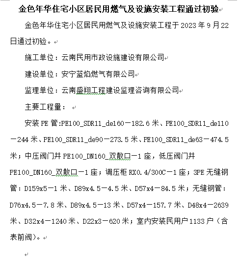 金色年華住宅小區(qū)居民用燃氣及設施安裝工程通過初驗