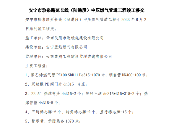 安寧市珍泉路延長線(陸港段)中壓燃氣管道工程竣工移交