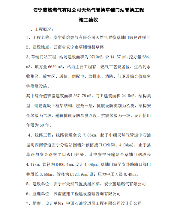 安寧藍焰燃氣有限公司天然氣置換草鋪門站置換工程竣工驗收