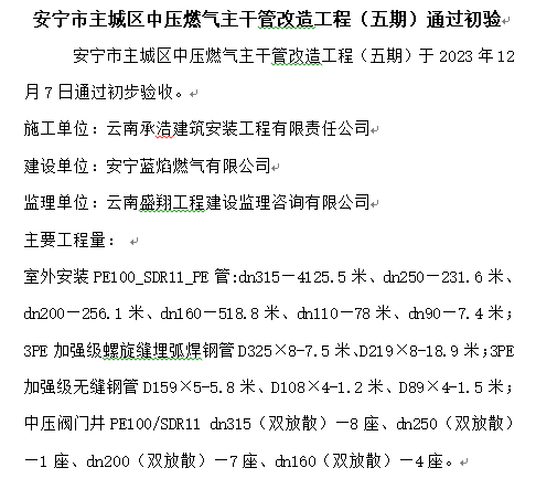 安寧市主城區(qū)中壓燃?xì)庵鞲晒芨脑旃こ蹋ㄎ迤冢┩ㄟ^初驗(yàn)