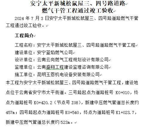 安寧太平新城松鼠屋三、四號路道路 燃氣干管工程通過竣工驗收