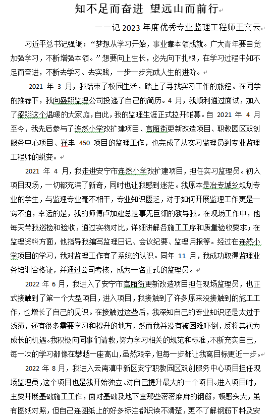 知不足而奮進 望遠(yuǎn)山而前行 ——記2023年度優(yōu)秀專業(yè)監(jiān)理工程師王文云