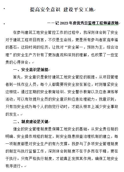 提高安全意識(shí) 建設(shè)平安工地 ——記2023年度優(yōu)秀總監(jiān)理工程師游雙敏