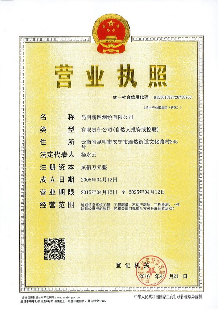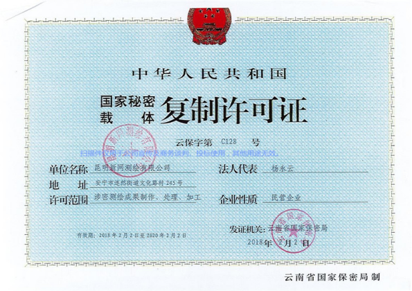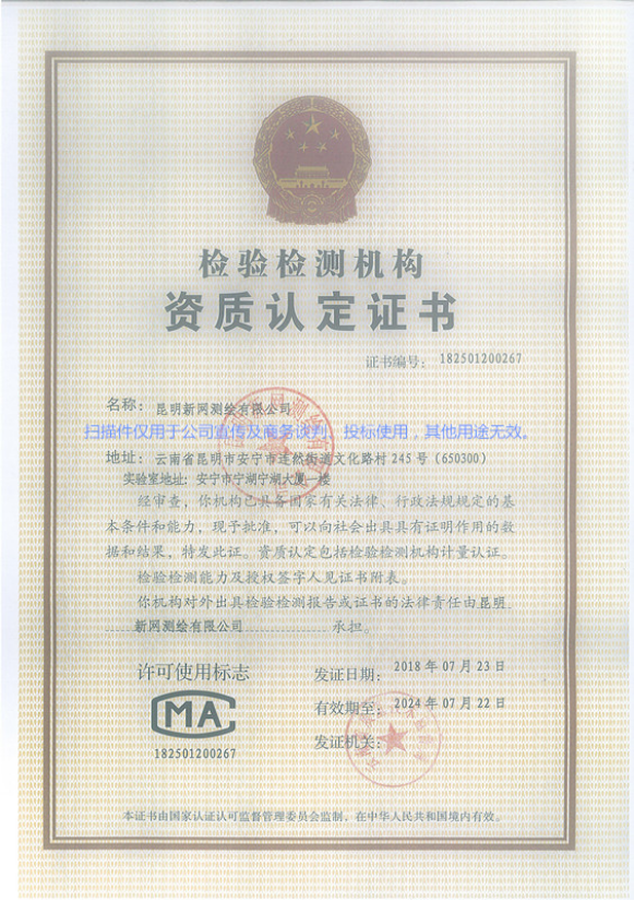 公司2005年5月取得云南省測繪局丙級資質,2014年4月取得國家乙級測繪資質證書,證號:乙測資字53100014號,2016年6月取得云南住房和城鄉(xiāng)建設廳:建設工程質量檢測資質證書,證號:建檢字第20150090104號,公司經營范圍:地理信息系統工程、工程測量、不動產測繪(房產測繪、地籍測繪)、工程檢測。