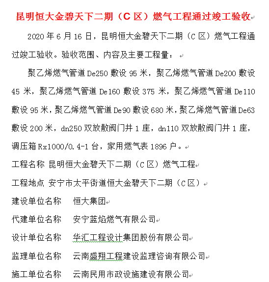 昆明恒大金碧天下二期(C區(qū))燃氣工程通過竣工驗收