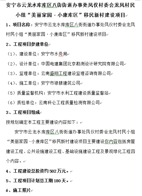 安寧市云龍水庫庫區(qū)八街街道辦事處鳳儀村委會龍鳳村民小組“美麗家園?小康庫區(qū)”移民新村建設(shè)項目