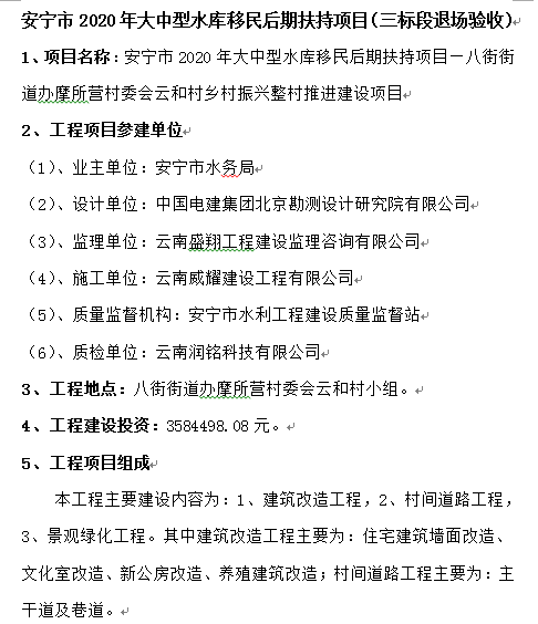 安寧市2020年大中型水庫移民后期扶持項(xiàng)目(三標(biāo)段退場驗(yàn)收)