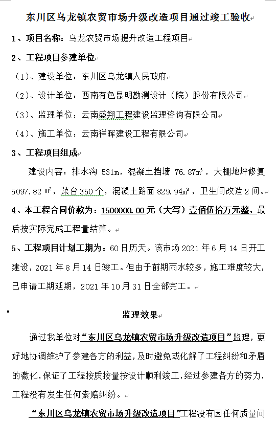 東川區(qū)烏龍鎮(zhèn)農(nóng)貿(mào)市場升級改造項目通過竣工驗收