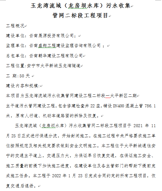 玉龍灣流域(龍房壩水庫)污水收集 管網(wǎng)二標段工程項目