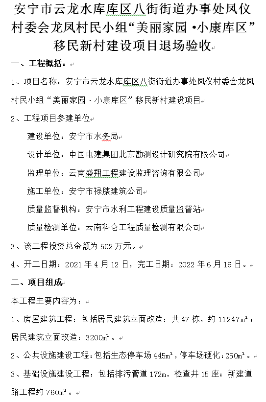 安寧市云龍水庫(kù)庫(kù)區(qū)八街街道辦事處鳳儀村委會(huì)龍鳳村民小組“美麗家園?小康庫(kù)區(qū)”移民新村建設(shè)項(xiàng)目退場(chǎng)驗(yàn)收