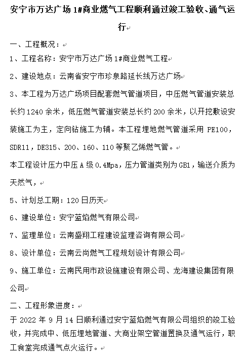 安寧市萬(wàn)達(dá)廣場(chǎng)1#商業(yè)燃?xì)夤こ添樌ㄟ^(guò)竣工驗(yàn)收、通氣運(yùn)行