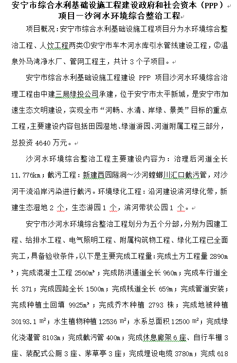 安寧市綜合水利基礎(chǔ)設(shè)施工程建設(shè)政府和社會資本(PPP)項(xiàng)目—沙河水環(huán)境綜合整治工程