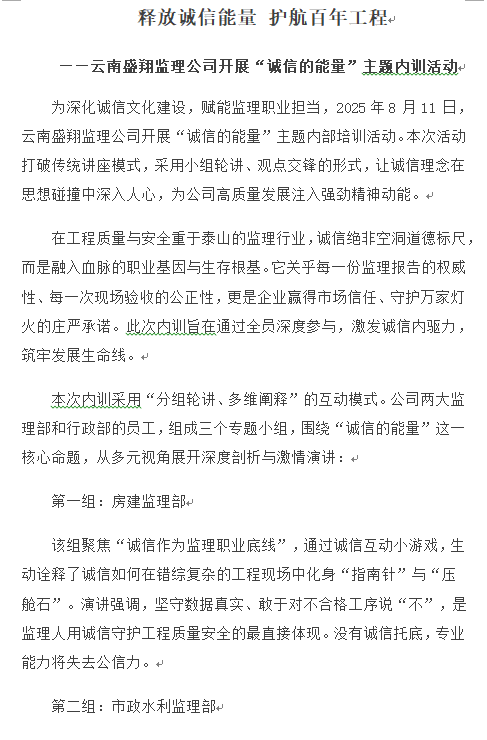 釋放誠信能量 護(hù)航百年工程 ——云南盛翔監(jiān)理公司開展“誠信的能量”主題內(nèi)訓(xùn)活動(dòng)
