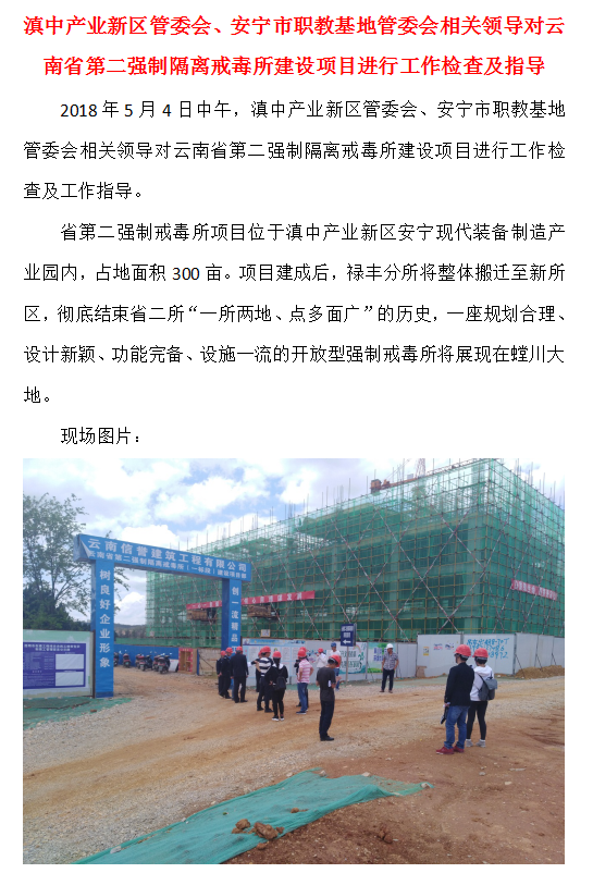 • 滇中產(chǎn)業(yè)新區(qū)管委會(huì)、安寧市職教基地管委會(huì)相關(guān)領(lǐng)導(dǎo)對(duì)云南省第二強(qiáng)制隔離戒毒所建設(shè)項(xiàng)目進(jìn)行工作檢查及指導(dǎo)