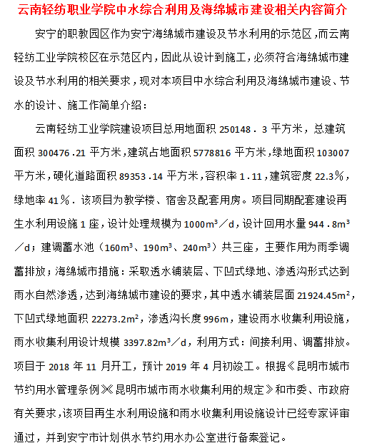云南輕紡職業(yè)學(xué)院中水綜合利用及海綿城市建設(shè)相關(guān)內(nèi)容簡介