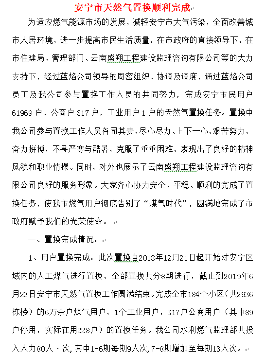 安寧市天然氣置換順利完成